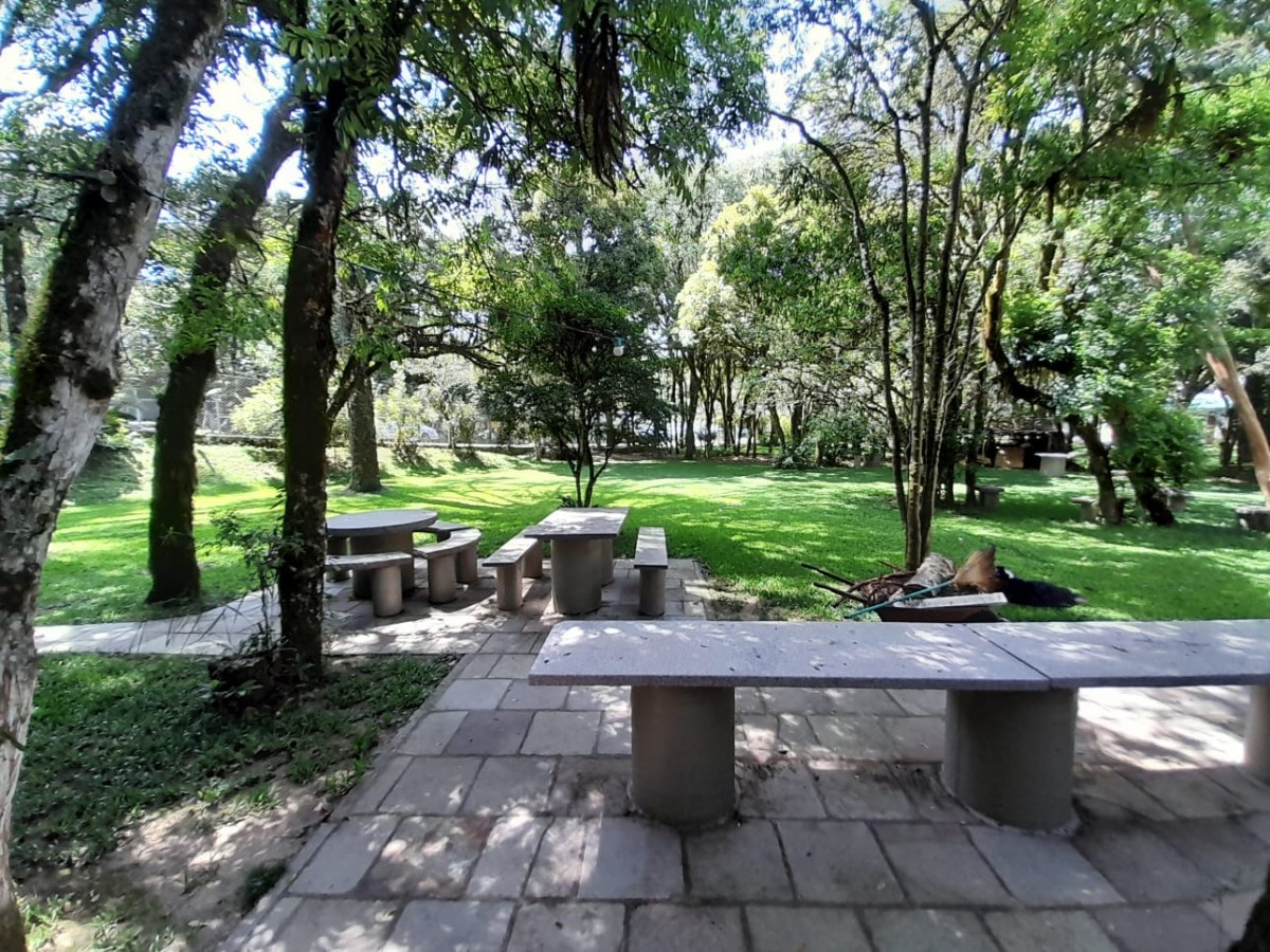 Pavimento Infeior: salão de festas com churrasqueira, lavabo, quiosque com forno de pizza e paejeira, terreno arborizado com mesas de pedra ao ar livre.